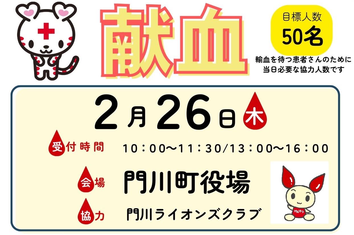 今回の献血は、門川ライオンズクラブ様のご協力で行います。心より感謝いたします。