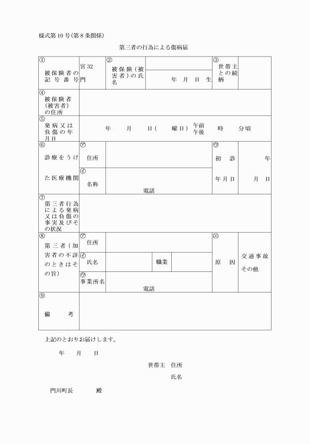 第6条 世帯主は,法第54条による療養費の支給を受けようとするときは,様式第8号による申請書に療養に要した費用に関する証拠書類を添付して町長に提出しなければならない。